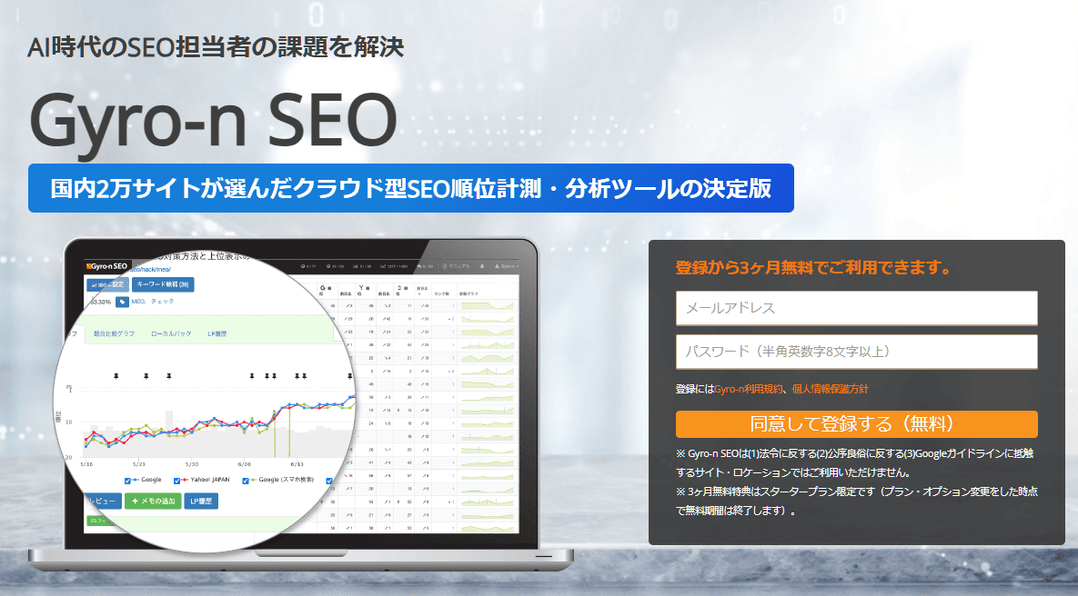 Gyro-n SEO(ジャイロンSEO)は検索順位の精密なモニタリングができるため、店舗ビジネスなどで重要となるローカルSEO対策に最適です。