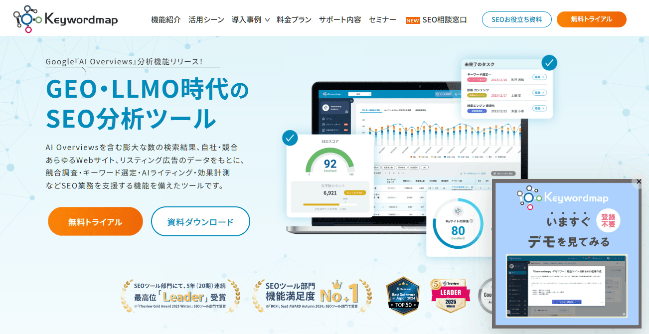 Keywordmap(キーワードマップ)は、ユーザーの検索意図を深く可視化し、データに基づいたコンテンツ設計を支援する国産SEOツールです。