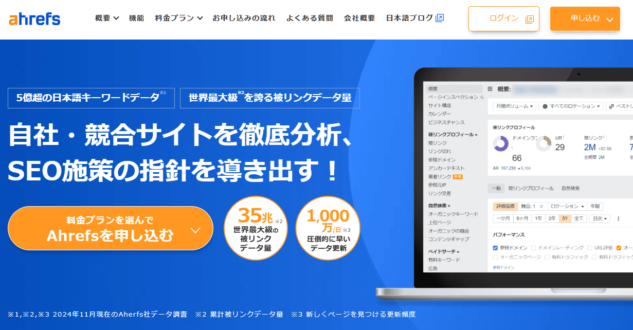 Ahrefs(エイチレフス)は世界最大級のリンクデータを保有する、被リンク分析において圧倒的な強みをもつ高機能SEOプラットフォームです。
