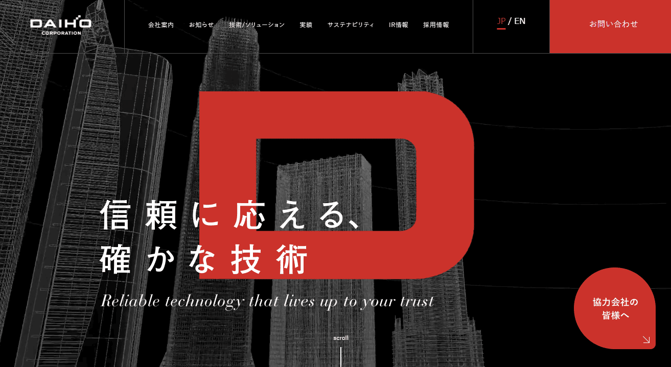 インパクトが強くかっこいいデザインを目指すなら、大豊建設のホームページは秀逸な参考事例の一つです。