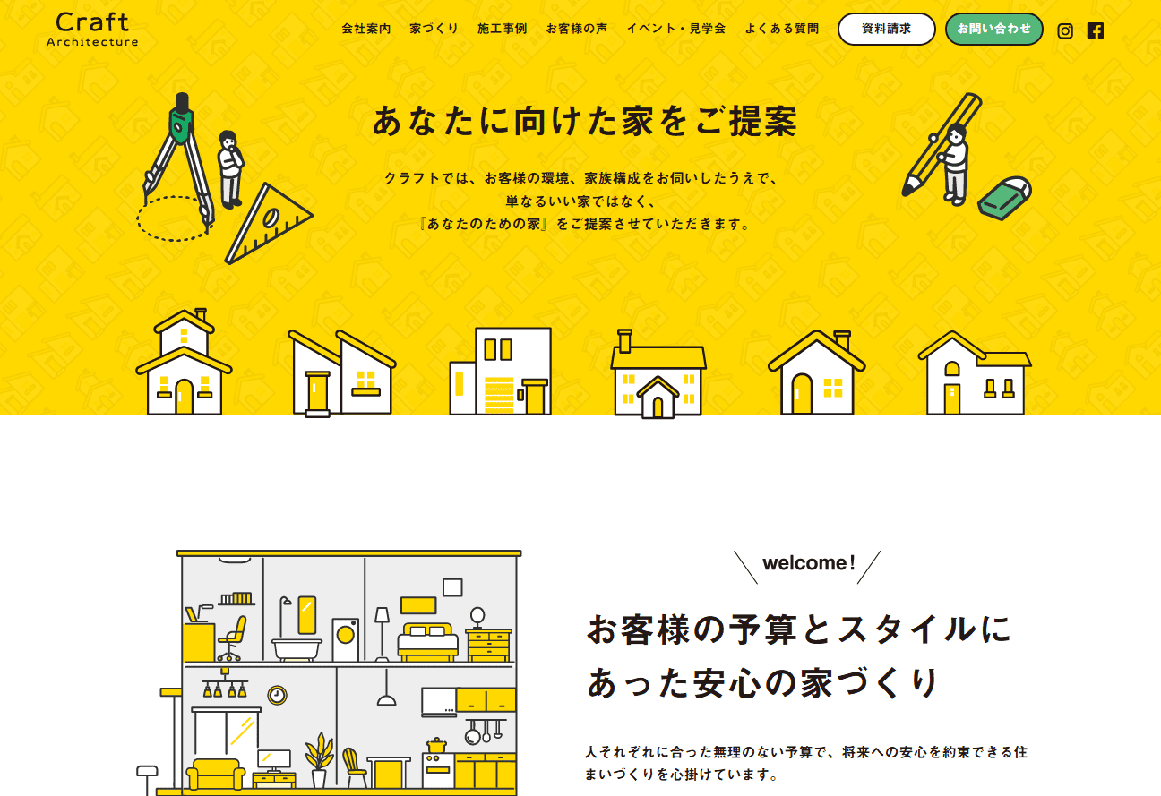 親しみやすい工務店のホームページデザインは、スタッフ・依頼者の笑顔や、温かみを感じるイラストが多用され、明るいカラーを多く使っているのが特徴です。