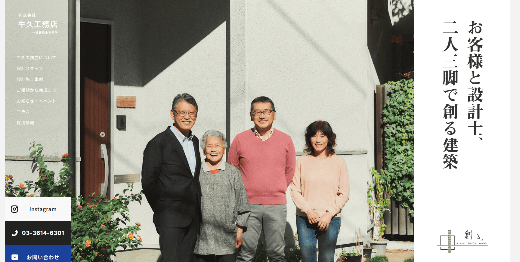 | 株式会社牛久工務店 | 画面左下に問い合わせ先を固定表示し、導線を確保 |