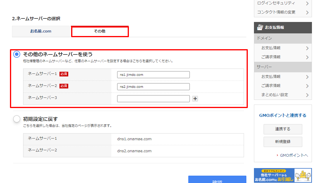 ネームサーバーの選択から「その他」を選択して、下記内容を入力して設定を行いましょう。