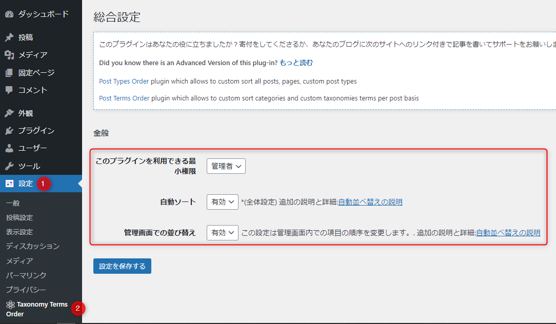Category Order and Taxonomy Terms Orderの設定は、WordPressの管理画面にある「設定」→「Taxonomy Terms Order」から行います。