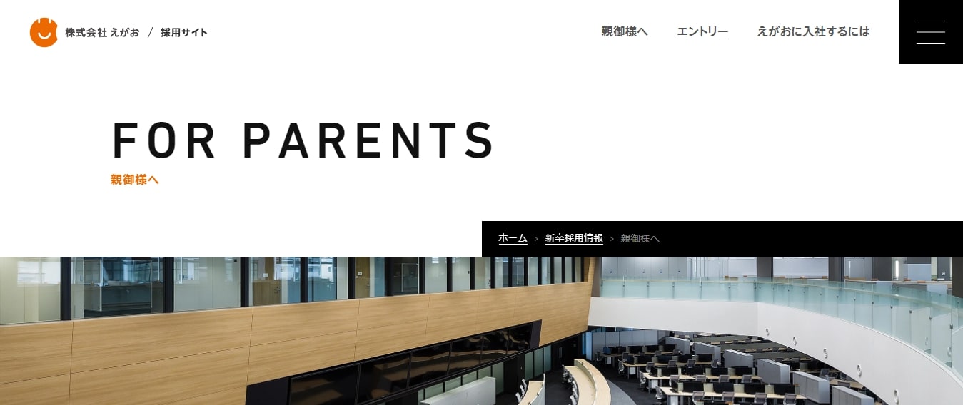 株式会社えがおの採用サイトはシンプルなデザインですが、求職者の保護者向けのコンテンツを掲載しているのが特徴です。