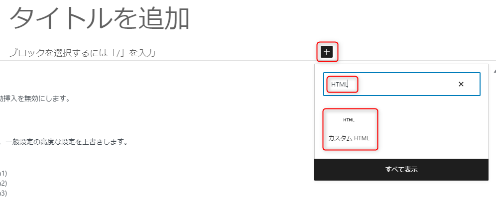 カスタムHTMLブロックを使うには「+」アイコンをクリックして検索窓に「HTML」と入力しましょう。